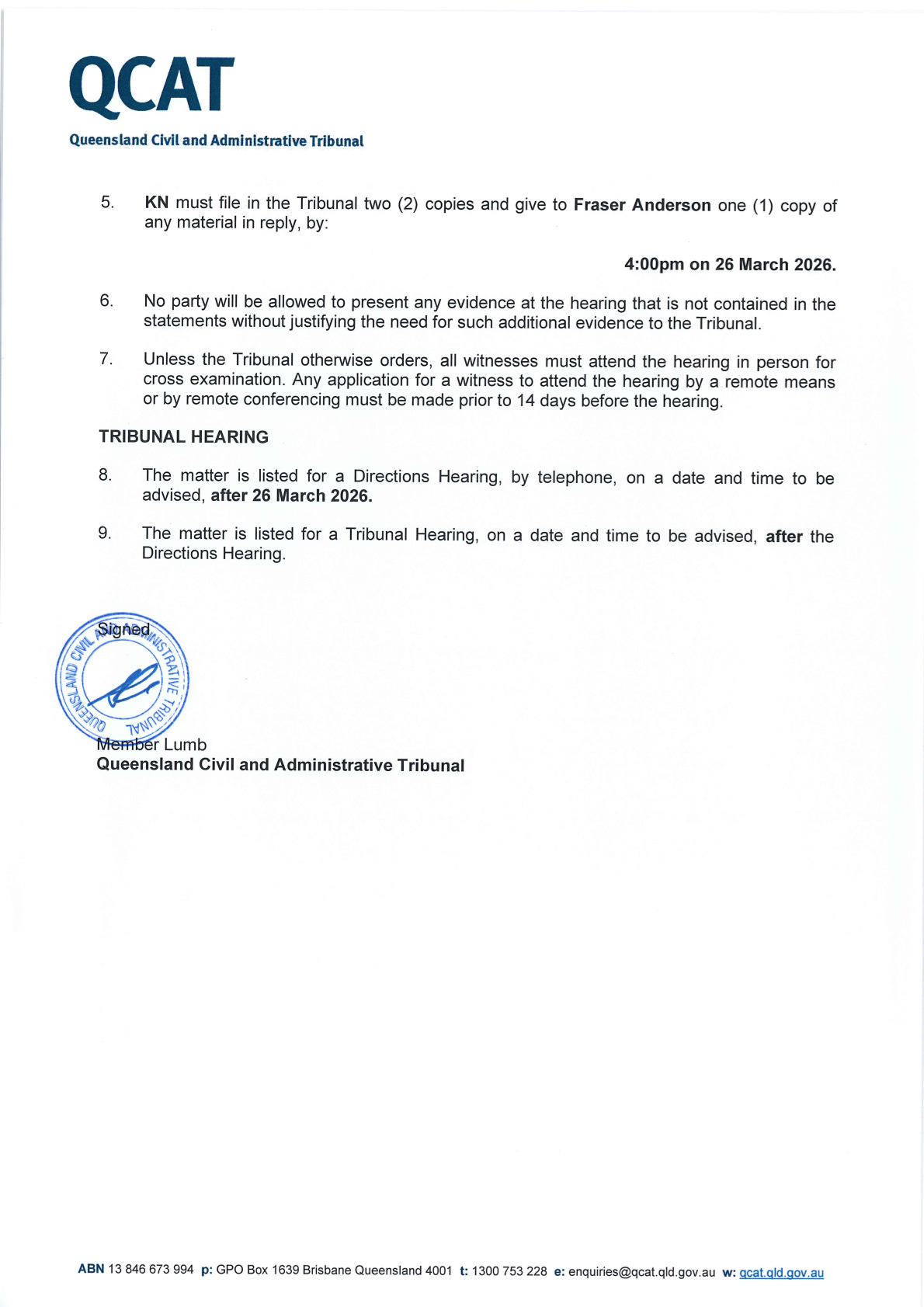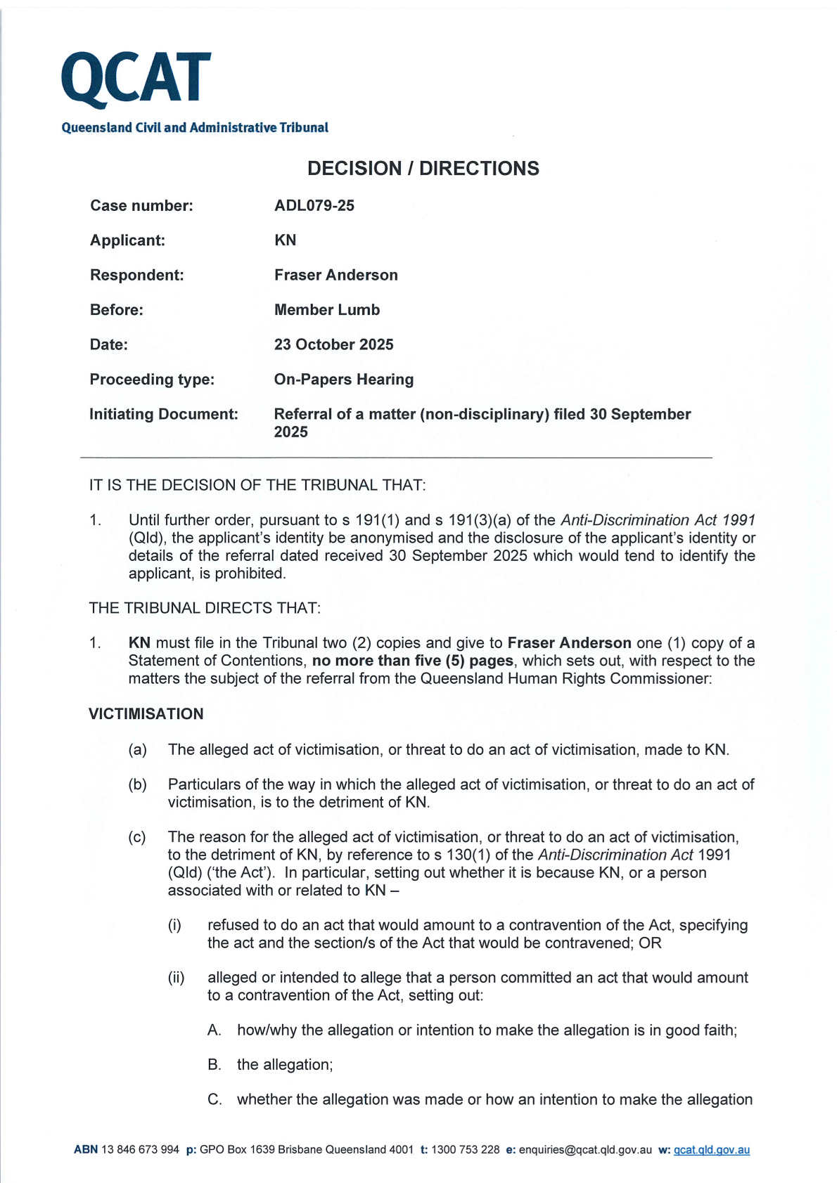On 23 October 2025, Member Lumb of the Queensland Civil and Administrative Tribunal issued what the Tribunal characterises as a “Decision and Directions” in matter ADL079-25, styled as KN versus Fraser Anderson. The document is four pages long. It is signed and sealed. It has the full institutional weight of the Queensland Civil and Administrative Tribunal behind it, or at least the full institutional appearance of that weight.