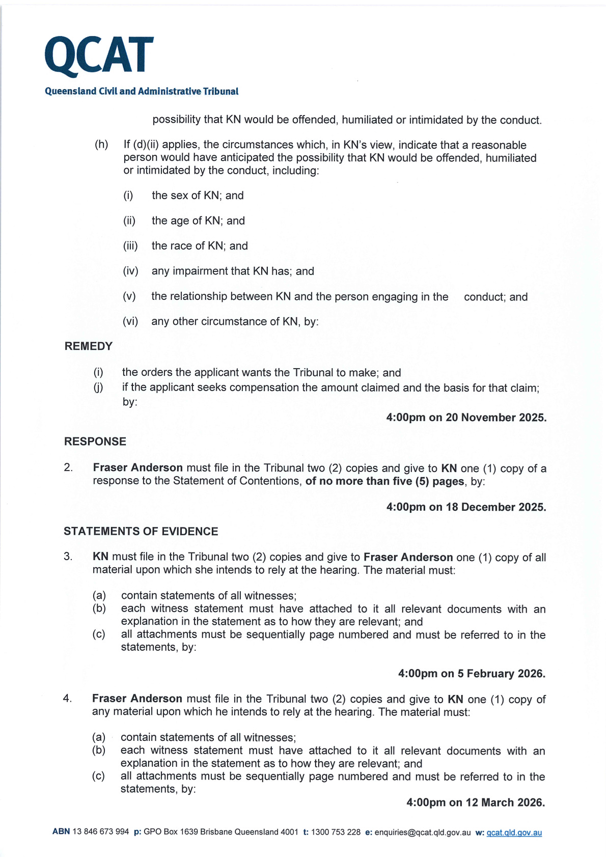 This is a complete procedural timetable for a hearing that, on my submission, cannot lawfully take place. It was issued on 23 October 2025, approximately one month after the referral from the QHRC was filed, without any examination of the jurisdictional objections I had raised and would raise formally. It proceeded on the assumption that the matter was properly before the Tribunal, that I had been lawfully served, that the constitutional bar under Burns v Corbett did not apply, and that the statutory preconditions for each of the three heads of claim had been met.