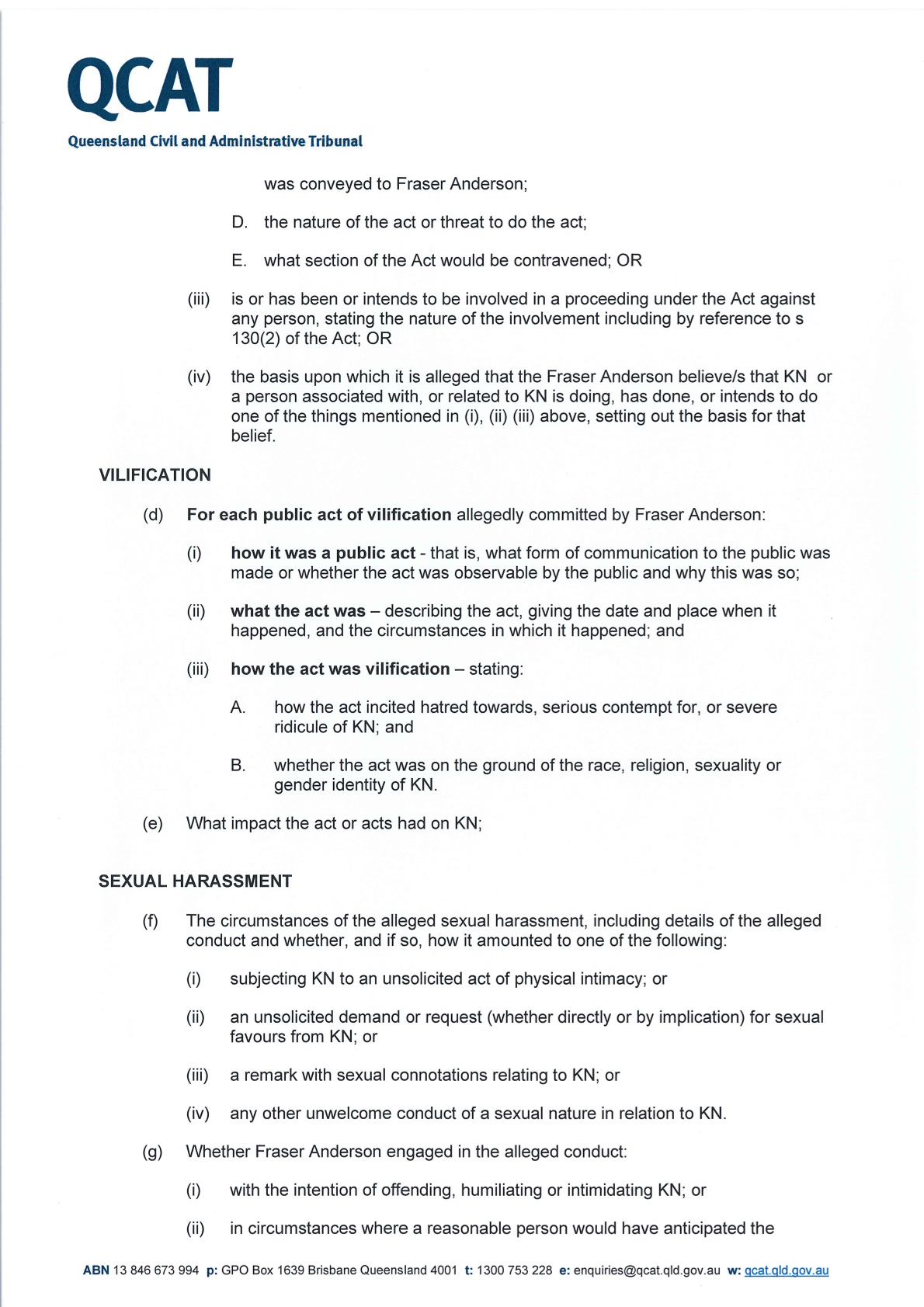 For vilification, Buckley is required to address each alleged public act individually, explaining how it was a public act, what the act was, and, critically, how the act was vilification. That last requirement is further broken down into two components: how the act incited hatred, serious contempt or severe ridicule of KN, and whether the act was on the ground of race, religion, sexuality or gender identity. The Tribunal has, in other words, asked the question that the QHRC never required Buckley to answer: how, specifically, does each act meet the statutory test?